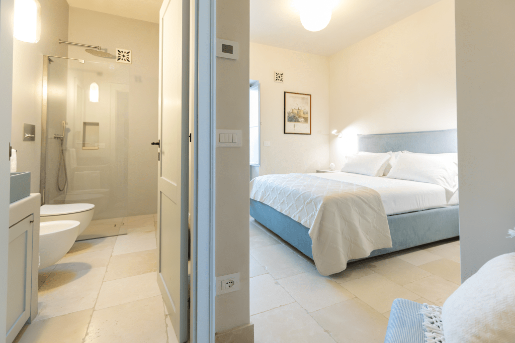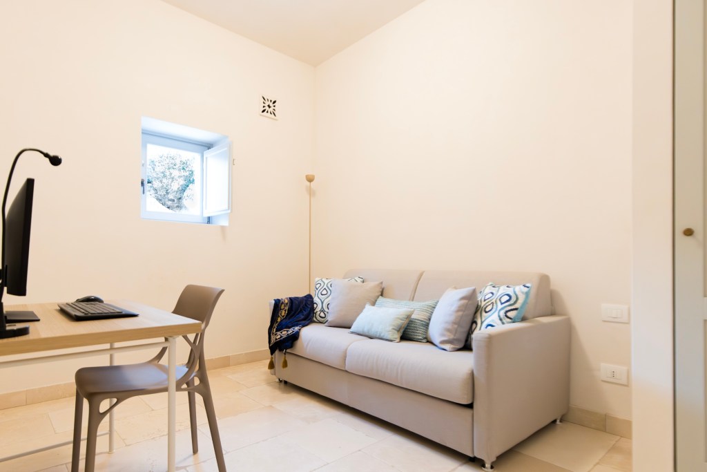 The villa’s layout is cleverly arranged into three separate wings to ensure comfort and privacy for everyone: the historic Trullo Wing features two unique bedrooms with their own bathrooms, the family-friendly Garden Wing offers three bedrooms, and a third wing provides another double bedroom and a cozy studio. At the centre of it all, a large, fully-equipped kitchen opens onto a covered patio, connecting to a bright and comfortable living room.